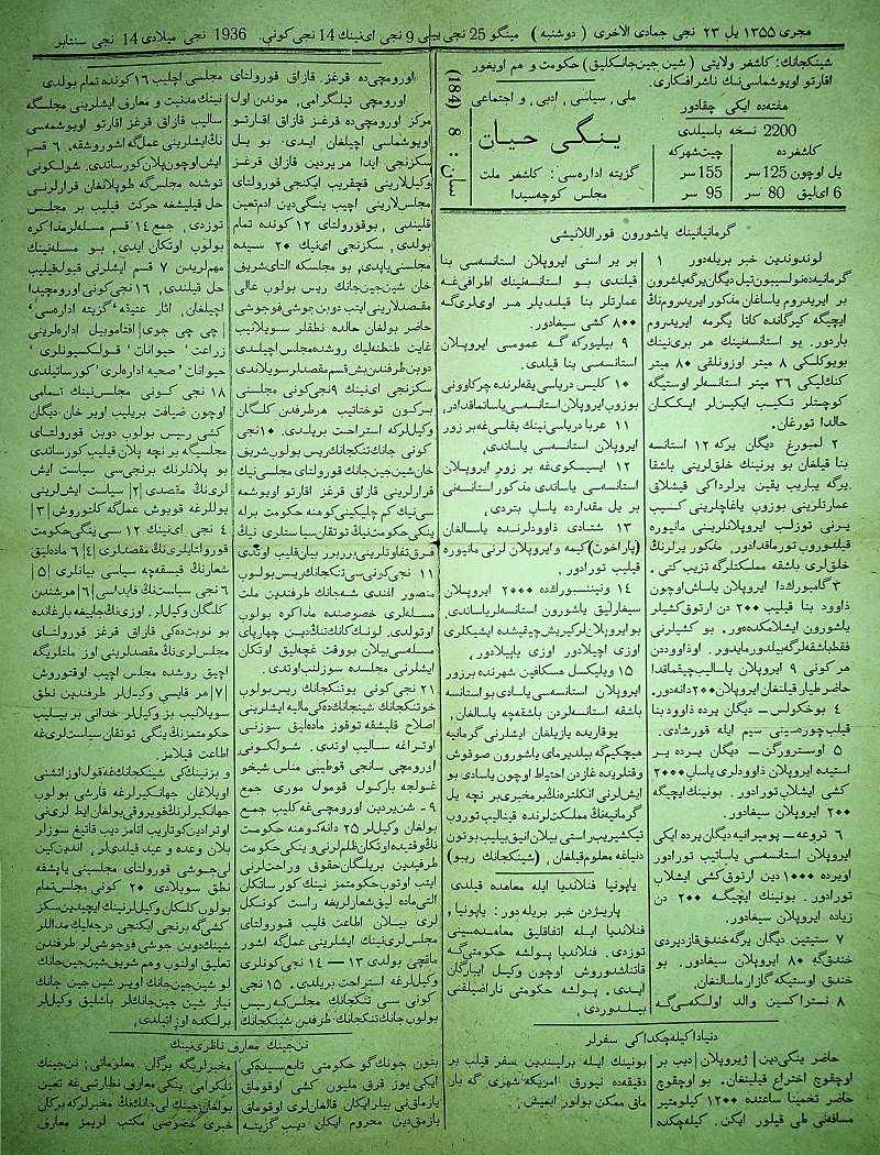 يېڭى ھايات 1936 «شەرقى تۈركىستان ھاياتى»